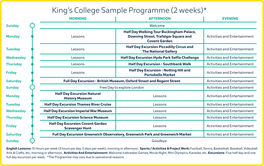 - 1 повноденна екскурсія щотижня — глибше занурення в атмосферу міста або поїздка до визначних місць Великобританії.